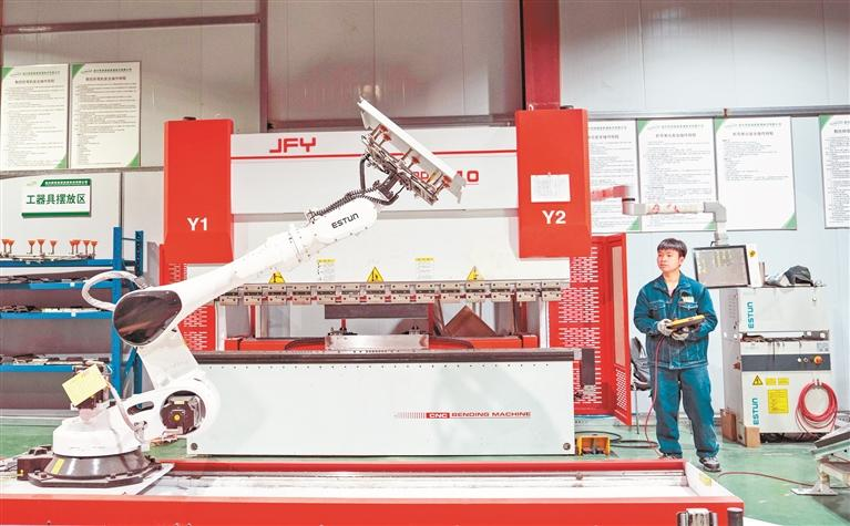 六盘水市盘州市一家新能源科技有限公司工人正在操作机器人生产钣金。 邓永长 摄