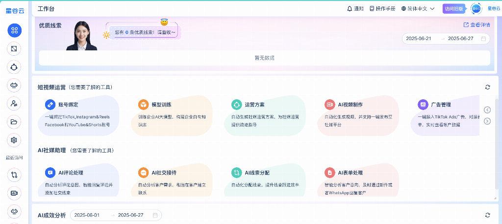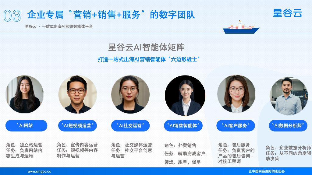 在出海的过程中,企业要拥抱数字化营销与构建多渠道推广。 而要实现这种高效转型与持续增长,往往需要专业伙伴的深度赋能。而星谷云提供的一站式出海AI智能体矩阵平台扮演了关键角色。 其整合的六大AI智能体(AI网站专家、短视频运营专家、社交媒体运营专家、AI外贸人、AI客服、AI数据分析师),为企业搭建了覆盖海外渠道拓展、智能内容创作、多平台客户互动与数据驱动决策的全链路智能营销引擎,显著降低企业布局海外市场的门槛。无论是海外独立站和搜索引擎推广、海外社媒推广、海外短视频推广,还是线下展会营销的全周期运营,星谷云都能精准赋能,帮助企业高效出海。无论是初创企业迈出海外第一步,还是成长型企业寻求规模扩张,亦或是成熟品牌进行全球升级,都能根据不同的需求来进行匹配,快速落地。
