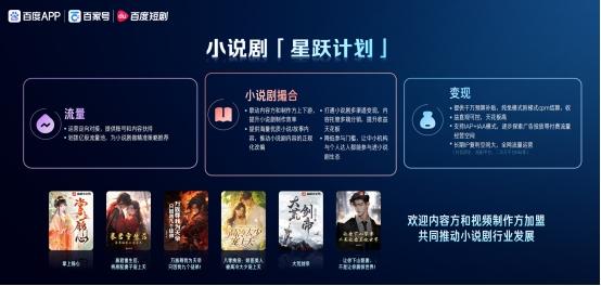 小说剧专项扶持推出“星跃计划”,平台联合七猫、纵横、百度小说等内容方,提供海量版权内容,并通过亿级流量定向扶持、内容合集发布和阶梯式变现机制,吸引更多的创作者和机构加入小说剧赛道,帮助小说IP从文本走向多平台、多形态的可持续开发。