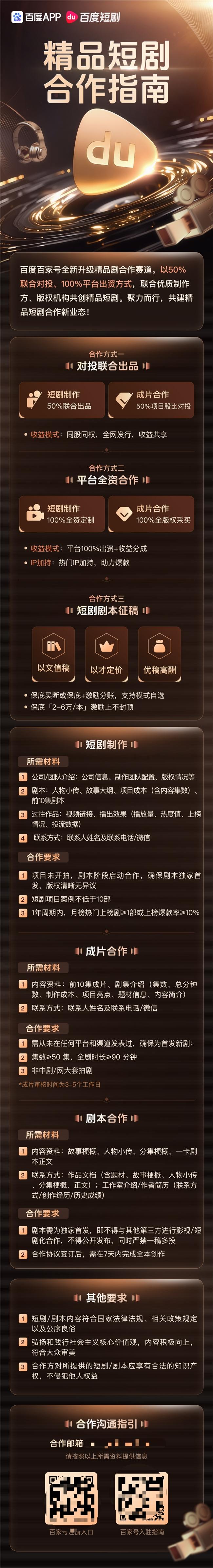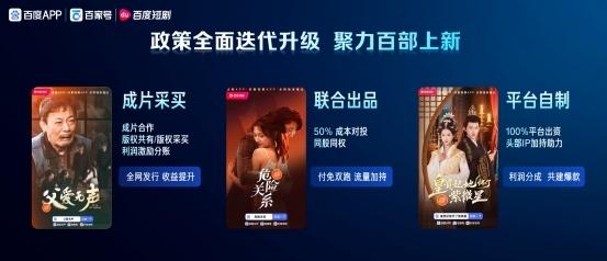 自2024年百度精品短剧上线以来,已上线精品短剧超百部,2025年出现首个破亿爆款剧,成绩斐然。精品短剧政策全面迭代升级,助力百部上新,已建立50% 联合对投,100% 全资定制两种合作方式,剧本+成片+制作,全类型均可覆盖,剧本支持保底买断或保底+分成方式,模式可自选。在该政策下,打造了包括和七猫合作的《皇室奶团萌翻全京城》《神豪萌宝》,和爱奇艺合作的《温柔染指》,以及平台全资自制剧《断网之刃》《皇贵妃她怀了紫微星》《准我吻下去》等在内的高热度精品短剧矩阵。其中,《皇室奶团萌翻全京城》上线首日即登顶多个热播榜,全网播放破3亿,成为“平台自制+联合出品”模式的标杆案例。同期,《断网之刃》连续三日上榜、最高单日热力榜19位;《准我吻下去》猫眼热度榜6.1-6.3连续三天上,最高榜位11位、抖音飙升榜47名;《皇贵妃她怀了紫薇星》爱奇艺微剧榜第2位,抖音热门短剧榜第2位,多部自制剧共同构建起平台多元化的内容矩阵。