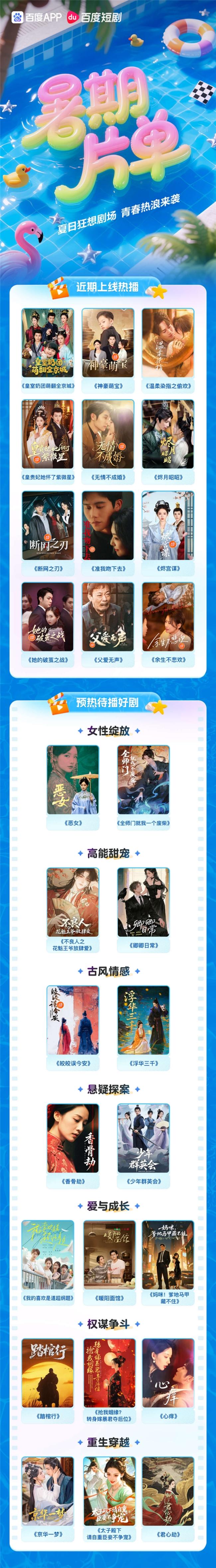 在会上,百度短剧发布暑期片单,宣布 2025 年暑期档将上线多部新剧,涵盖成长、女性、穿越、甜宠、古装、悬疑等多元题材,丰富平台内容供给,满足用户暑假期间多元消费需求。同时,平台继续升级精品短剧合作权益,联合制作方、版权机构共创精品短剧,共建精品短剧合作新生态。