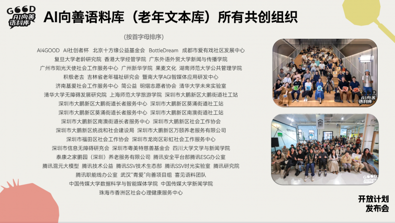 2025年7月11日,腾讯AI向善语料库开放发布会在北京举行,这次发布会的主题是“AI时代没有旁观席,AI普惠一个不能少”。发布会上,腾讯与百余家社会组织公益共创的AI向善语料库(老年文本库)正式面向公益组织和非营利性研究机构开放申请,这是国内外首个通过社会公益共创构建,又面向公益组织开放的老年语料库,在一定程度上开创了公共语料库构建与开放的新范式。