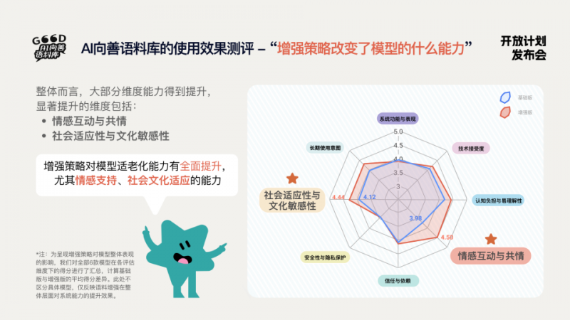 本次发布会上,清华大学未来实验室的何丽雯女士代表实验室研究团队对AI向善语料库进行了使用方法的介绍,并进行了专业系统的评估,她指出,搭载了AI向善语料库后,大模型并非在所有维度上都得到了显著提升,但是在对老年人情感支持和文化适应性方面有了明显的提升。腾讯SSV产品经理周滢垭和复旦大学老龄研究院申琦教授分别介绍了公益组织和研究机构申请AI向善语料库的流程。北京邮电大学张为威老师和AI4GOOD公益产品经理孙心怡,分别作为AI向善语料库的学者使用方、公益机构使用方,介绍了自己的使用经验和AI作品。