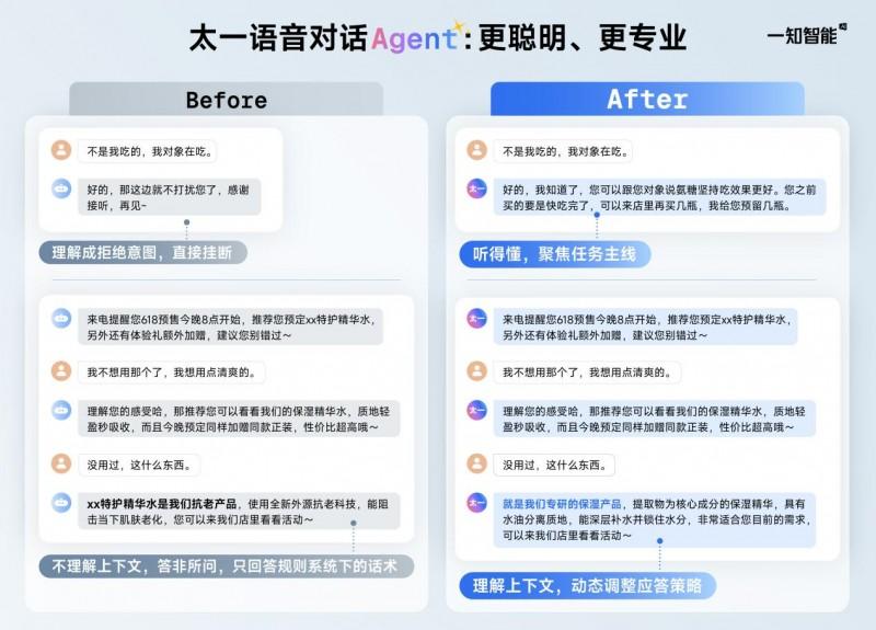 为此,一知智能此次推出的“太一语音对话Agent”,深度解决用户场景适配性痛点。相较于豆包、DeepSeek等通用大模型,太一更聚焦语音交互深度与垂直业务场景理解,输出的内容高可控与强合规;相较于规则型AI外呼,太一又具备复杂语境理解力与动态思考能力,对话更流畅自然。可以这么理解,“太一语音对话Agent”更像是一个听得懂、会思考、有温度且“业务能力强”的“高情商营销专家”。
